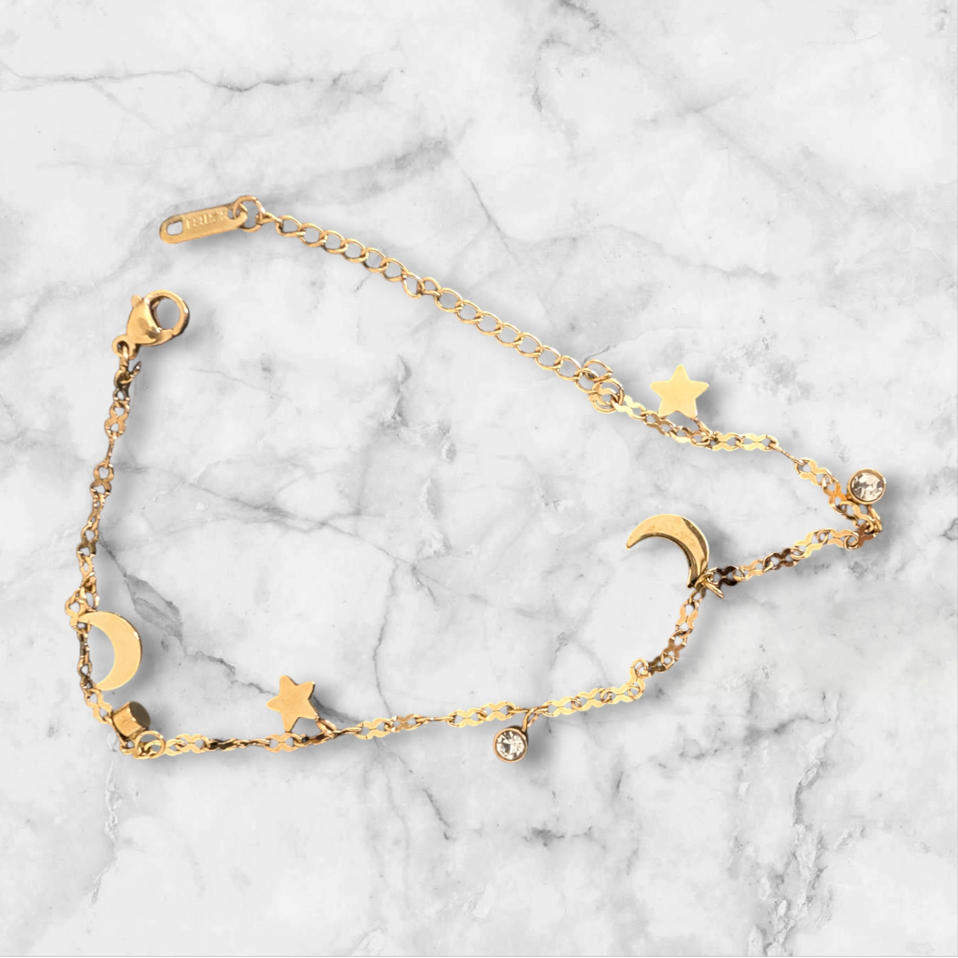A delicate gold-toned chain featuring moon and star charms.